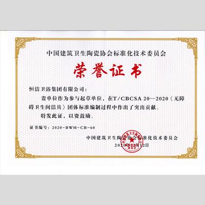 獎 項:TCBCSA 19-2020《薄型陶瓷洗面器》團體標準編制突出貢獻獎
