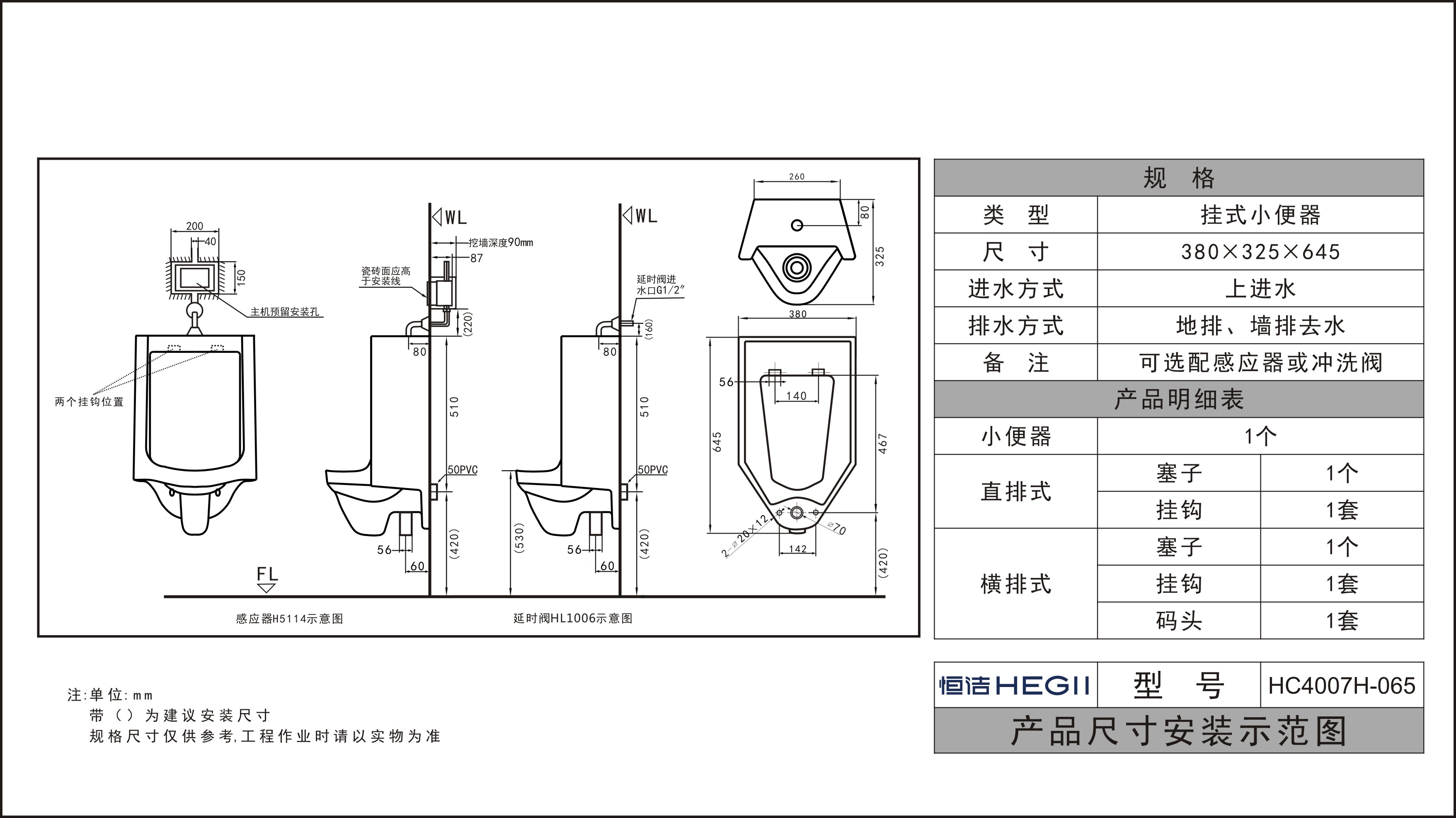 備注:可選配沖洗閥HMV21006\21002;感應器HMV11050AC/DC(需搭配上進水配件)